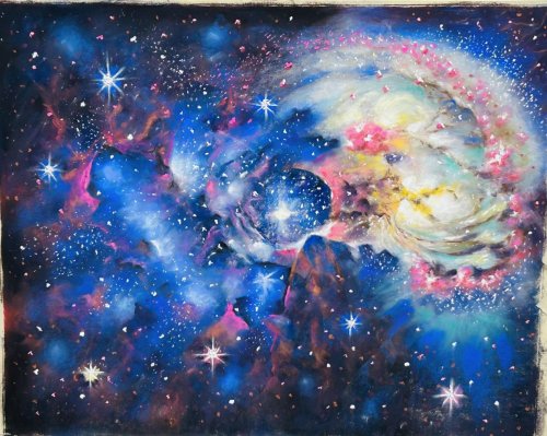 近年来,张彤卫将艺术视野投向了更为浩瀚的宇宙空间。经过多年潜心研究,她创新性地运用矿物质材料,创作出多幅探索宇宙奥秘的系列作品。这些画作将古典艺术传说与现代时尚元素完美结合,形成了独具特色的艺术风格。在《星际对话》系列中,她以斑斓的色彩描绘宇宙的深邃,用流动的笔触表现星云的变幻,在画布上构建了一个充满哲学思辨的艺术宇宙。