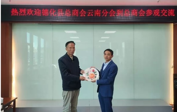 德化县总商会云南分会会长肖志鹏向云南省福建总商会赠送德化白瓷“花开富贵”,希望双方在未来的合作中,携手并进、硕果累累。