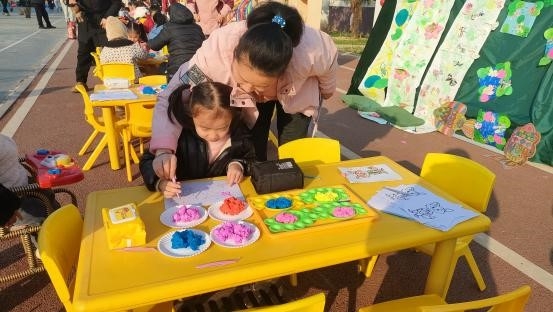 民间艺术与传统游戏区同样精彩纷呈。非遗纸浆画让幼儿在亲子协作中体验手工乐趣,完成作品后拍照留念;豆“把福带回家”活动,家长握著孩子的手共同书写“福”字,组成寓意美好的“百福图”;亲子脚踏车闯关赛充满动感,家庭默契配合完成S路挑战;古韵投壶的传统游戏,让幼儿在投掷中感受古人娱乐的雅趣。面部彩绘、捏泥人、猜灯谜、欢乐套圈等活动各具特色,孩子们在动手实践与互动体验中,加深了对传统文化的认知与喜爱。