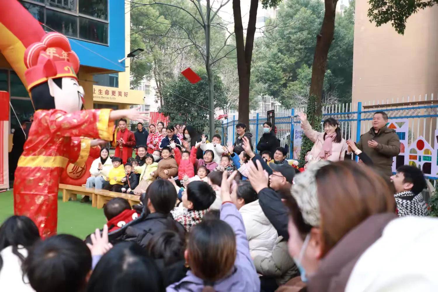 伴随着欢快的音乐,“财神驾到”环节拉开了活动序幕,幼儿园内处处传递着新年的喜悦。装扮得栩栩如生的“财神爷”手持金元宝,迈着喜庆的步伐走进活动现场,向孩子们派送新年红包祝福,孩子们和家长纷纷伸出双手接住,现场暖意融融。拍手互动环节,老师带领孩子们跟着节奏拍手起舞,简单欢快的动作让孩子们迅速融入氛围,一张张笑脸如同冬日里的暖阳,照亮了启点幼儿园整个园区。