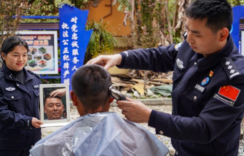 (户籍民警为前来照身份证的群众免费理发)