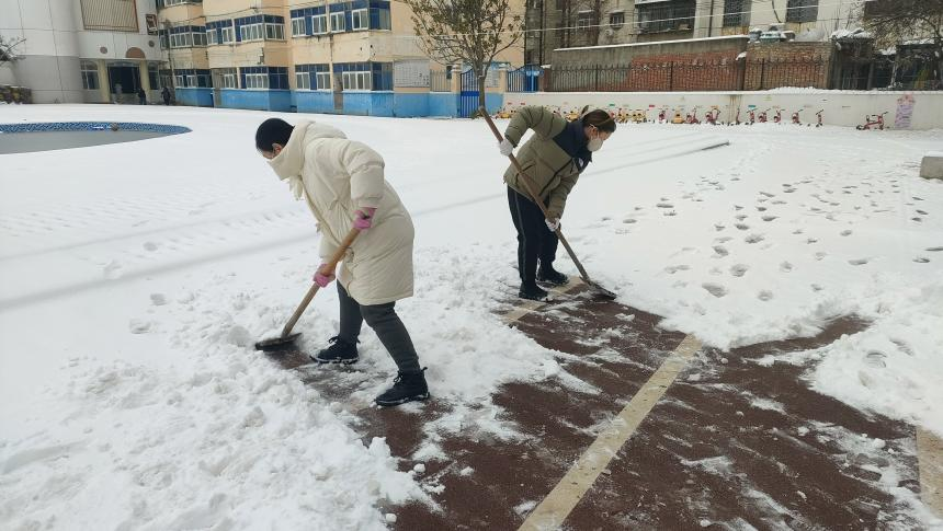 寒风里,老师们的热情却丝毫未减,大家分工明确,配合默契。有的挥舞着扫帚清扫路面浮雪,有的握着铁锨铲除结冰的硬块,有的合力搬运堆积的雪堆,尽管指尖冻得发红、额头却沁出汗水,却没有一人喊累,个个干劲十足,用行动诠释着责任与担当。