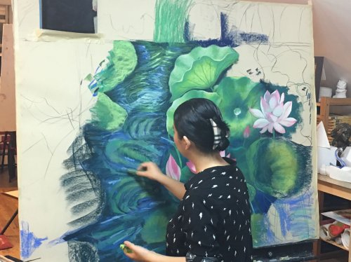 如果說駿馬代表了實現和平的動態力量,那麼張彤衛的油畫作品《荷花盛開》則完美詮釋了和平的內在狀態——和諧共生。這幅作品是她此次尤為用心的創作,畫面中一池清荷亭亭玉立,碧波蕩漾間,九條色彩斑斕的金魚自在戲耍,構成了一幅寧靜而充滿生機的景象。