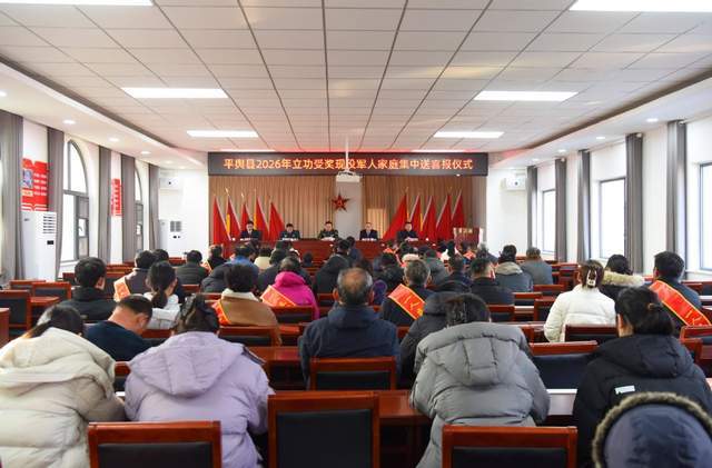 2月3日上午,平舆县2026年立功受奖现役军人家庭集体送喜报仪式在县人武部四楼会议室隆重举行。平舆县县委常委、人武部政委焦大磊同志出席仪式。荣立三等功的30名现役军人家属、各乡镇(街道)退役军人服务站站长、退役军人事务局机关工作人员参加仪式。