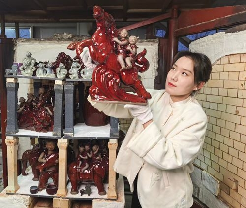 中国都市哦报道网河南讯(程传忠 报道)2月6日,记者走进郸城县张玉萍陶瓷泥塑工作室,只见青年陶艺家张玉萍正在开窑,张玉萍为即将到来的马年春节烧制出陶艺作品《一马当先》,作品长43厘米、宽22厘米、高45厘米。