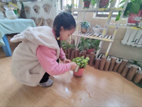 种植结束后,孩子们回到班级,化身细心的“绿植小管家”。在班级绿植区,他们有序拿起小喷壶、浇水杯,为绿萝、多肉、吊兰等盆栽浇水。孩子们小心翼翼地喷洒水珠,认真擦拭叶片上的灰尘,时不时凑近观察绿植状态,轻声和小伙伴交流:“我的小植物喝饱水啦!”在呵护绿植的过程中,孩子们的责任感与耐心悄然萌芽。
