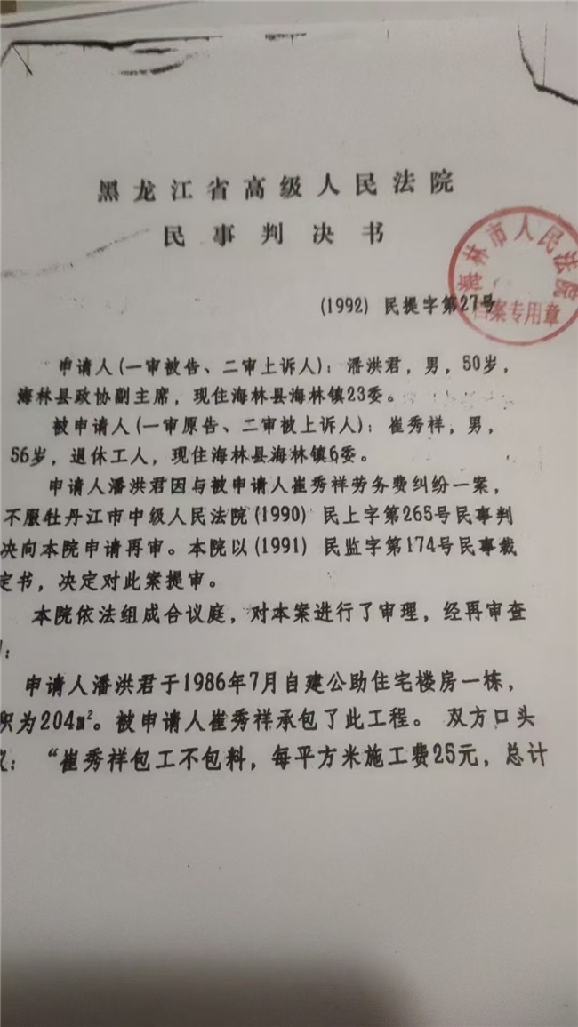 根据《民诉法》笫四十九条规定,民事当事人有权阅卷与复制。黑龙江省海林市(县)原政协党外副主席潘洪君遭遇市委委员法院长高峰挟私驾讼,套取伪证故意错判,经各级政协关注,两高指令黑龙江省高院调卷提审,撤销了牡丹江市中院与海林市(县)法院故意错判。奇怪地事情是:当年黑龙江省政协法制办主任任永达同志陪同全国政协法制视察团赴牡丹江市视察,向按待的市委副书记,常务副市长(后升任省委统战部长,省政协副主席)曹广亮同志反映此案,促成牡丹江市中院进入监审程序。当庭被一审法院院长挟私驾讼的原告崔秀祥曝出三个“雷儿”:一,1997年崔做为法人的工程队包工不料为潘建房,时任工商局长的高峰以介绍水产公司工程为诱饵,让他施工中使坏。造成了质量事故,撂下不干,跑水产施工去了;二,事过两年,高峰升任海林县(1990年撤县建市)法院院长,又让崔到法院民事起诉,免交诉讼费,还打了保票包赢;三,一审法官出示以崔秀祥与工友小刘,王瓦匠,张瓦匠,马木匠署名写给检察院的《举报信》转到法院民庭做证。崔说他并不知情。