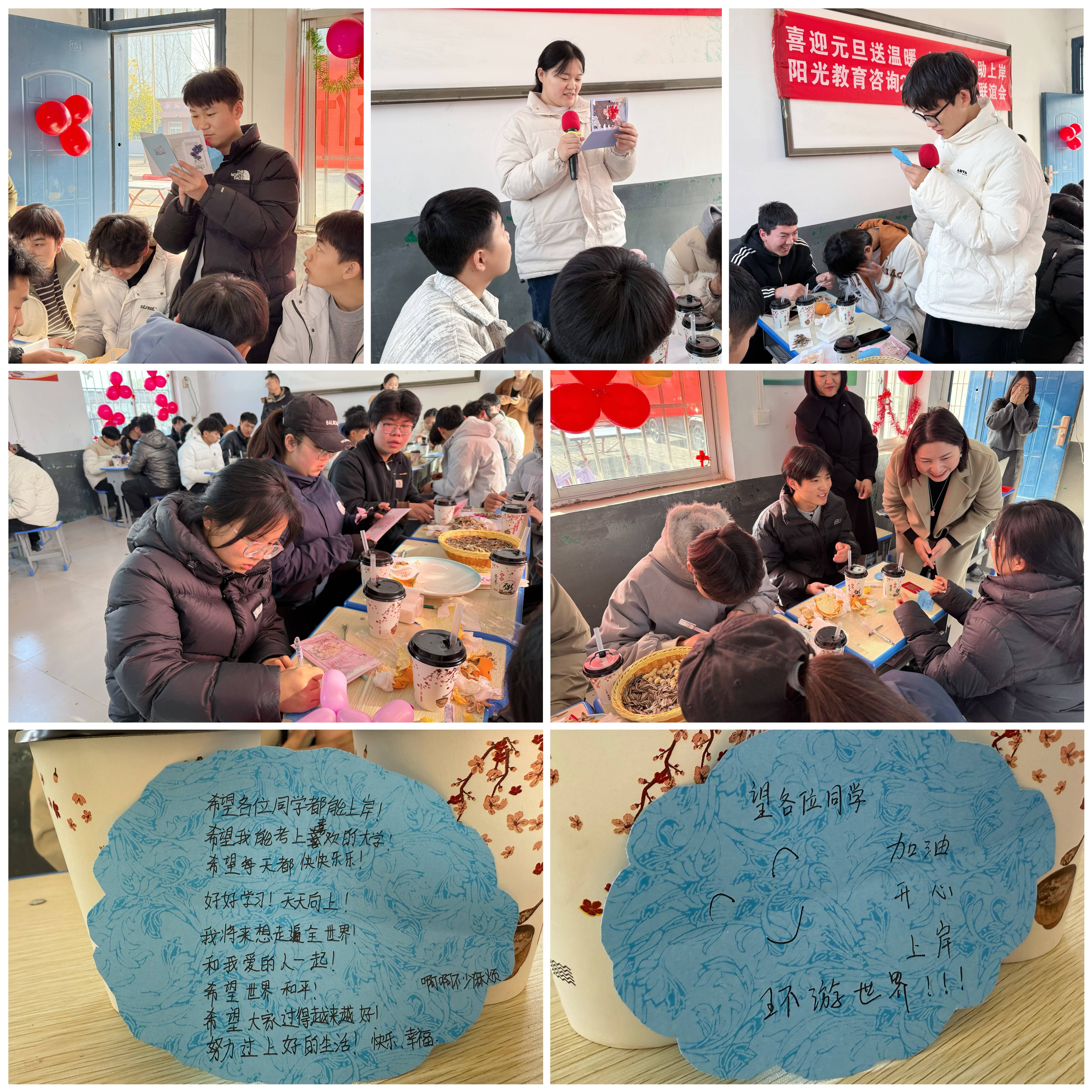 2025年12月25日,驻马店市驿城大道与创业大道交汇处西200米的阳光教育咨询升学规划指导中心高三特训班教室,被彩带、气球和学生们亲手绘制的愿望卡装点一新。一场由阳光教育联合鼎校甄选驻马店城市服务中心共同策划的“喜迎元旦送温暖,轻松备考助上岸”新年联谊会在这里温情上演。