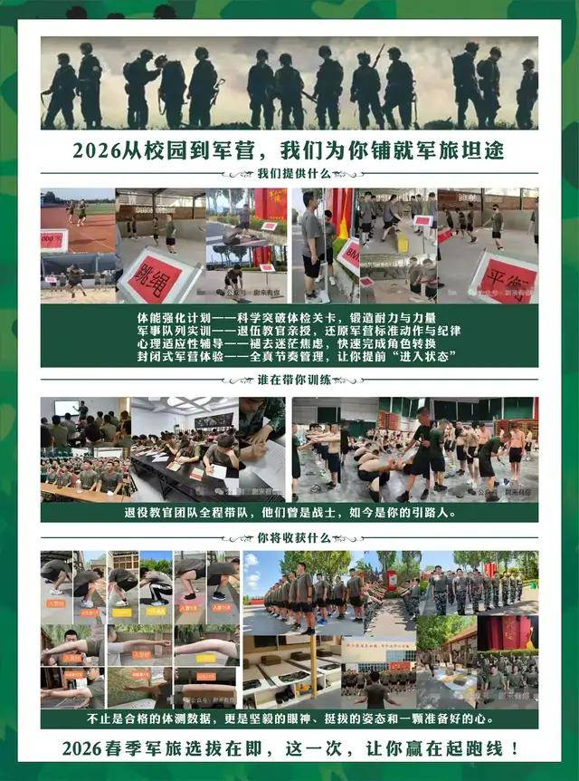 2026年春季军旅选拔在即,对于已报名或计划应征的青年来说,这场役前训练不仅是一次体能上的冲刺,更是一次心理上的武装。“我们为你铺就军旅坦途”,这不仅是宣传语,更是阳光教育训练营对所有怀揣军旅梦青年的郑重承诺。如果你也已准备好奔赴那一抹橄榄绿,不妨让这场“预演”,为你打下第一块坚实的基石。迷彩梦不止于向往,更需一场真实的奔赴。