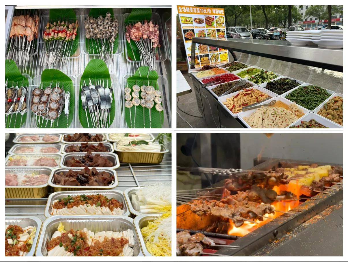 傍晚华灯初上时,京都福满楼夜市已是人声鼎沸的热闹景象,烤串的香气与啤酒的麦香相互交织,浓郁的市井烟火气扑面而来。摊位前,鸡翅、鸭肠、香菇、鲍鱼……各类新鲜食材琳琅满目,让人目不暇接。后厨烧烤区里烟火蒸腾,炭火“噼啪”作响,蒜蓉生蚝、烤茄子、烤掌中宝、锡纸牛板肠等滋滋冒油,香气四溢。