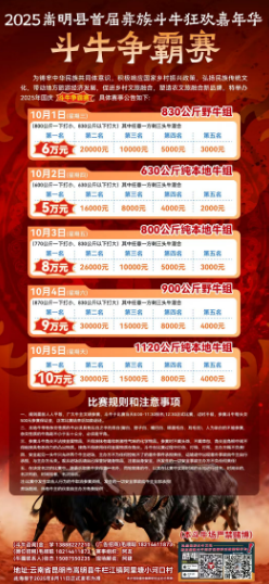活动现场,每一场斗牛对决都将点燃观众的激情,斗牛们身强力壮,勇猛无比,在场上展开激烈角逐,让观众大饱眼福。此次斗牛比赛设置了多个级别和组别的比赛,包括830公斤级野牛组、630公斤级本地牛组、800公斤级本地牛组、900公斤级大野牛组以及1120公斤级纯本地牛组。10月1日—4号期间每日14:00准时开赛,10月5日13:00准时开赛。此次比赛还将对前5名获奖者进行2000元到100000元不等的现金奖励。快来现场为心仪的斗牛加油助威,感受那份血脉偾张的紧张与刺激,见证勇者的诞生!