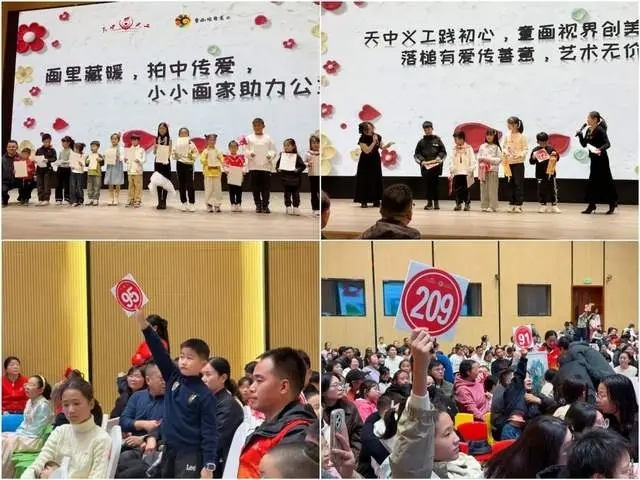 公益“童”行,为爱助力。10月19日下午,天中义工携手童画视界在青少年宫共同举办“落槌有爱,艺术无价”公益拍卖会,为爱助事实孤儿项目筹集善款,让孩子们的画作为更多需要帮助的事实孤儿点燃希望之光。众多学生家长和爱心人士莅临现场,共同见证这场艺术与公益的美丽邂逅,用行动传递爱与奉献的力量。