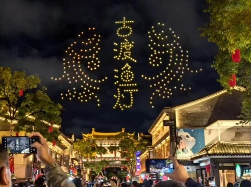 官渡古镇内,绚丽的“国潮渔灯会”与热闹的民俗巡游吸引了如织的游人。宝象河上花灯摇曳的渔船复刻“官渡渔灯”盛景,“穿越八景”主题景观与金刚塔、妙湛寺古建交织,无人机光影秀划破夜空的瞬间刷屏社交平台。