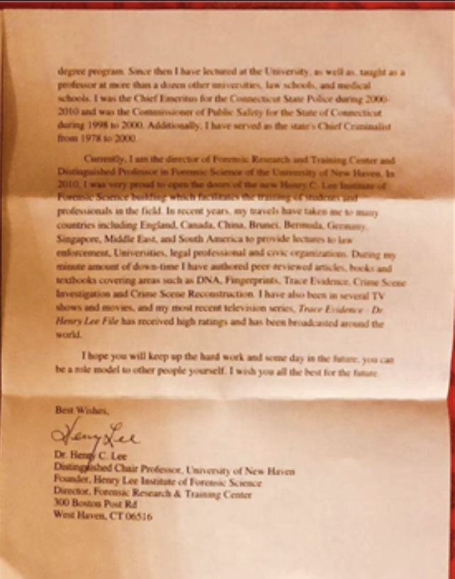 李博士不仅是一位德高望重的刑事鉴识大师,更是一位对后辈华人倾注了无限关怀的长者。他珍视一个华裔少年寄去的书法作品,说要“永久保存”;他用一张两张的亲笔信函,用心回复一个素未谋面的孩子。他用自己的行动告诉李彤,什么是“传帮带”,什么是“薪火相传”。他让李彤明白,一个人的成功,不仅在于自己取得了多大成就,更在于他帮助了多少人走向成功。